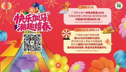 消费满额送彩票、幸运大转盘赢千元代金券……N+福利邀你共赴嗨GO狂欢热潮。12月31日,广场积分商户单笔消费满188元凭有效消费小票至5座1楼领奖处兑换中国福利彩票刮刮乐1张。(会员每人每卡限领1张,数量有效赠完即止,详见刮刮乐活动须知公示);12月31日-1月3日,广场积分商户单笔消费满518元并无感积分成功,即可参与线上幸运大转盘抽奖有机会赢取1000元商场代金券、喜来登自助餐券、黄金饰品等惊喜好礼!(每日限量200份,具体中奖概率详见服务台活动细则公示)
